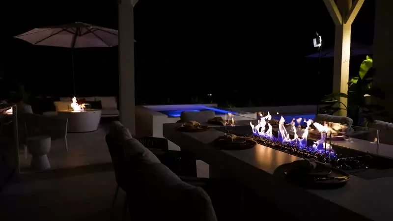 Fluid™ Concrete or Teak Wood Surround; Grade 304 Stainless Steel (Optional Black Ceramic Coating) Burner