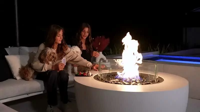 An optional glass cover plate allows for easy conversion to a coffee table when the fireplace isn’t in use.
